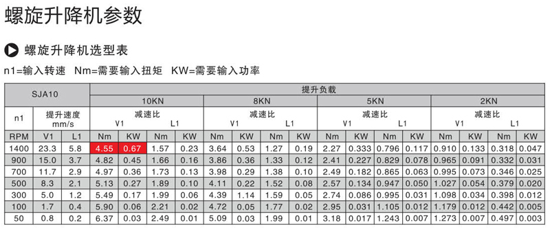 螺旋升降機正常工作狀態下的輸入功率不能超過最大輸入功率,輸入功率kw=(滿載扭矩Nm x負載率x輸入轉速rpm )/ 9550m,