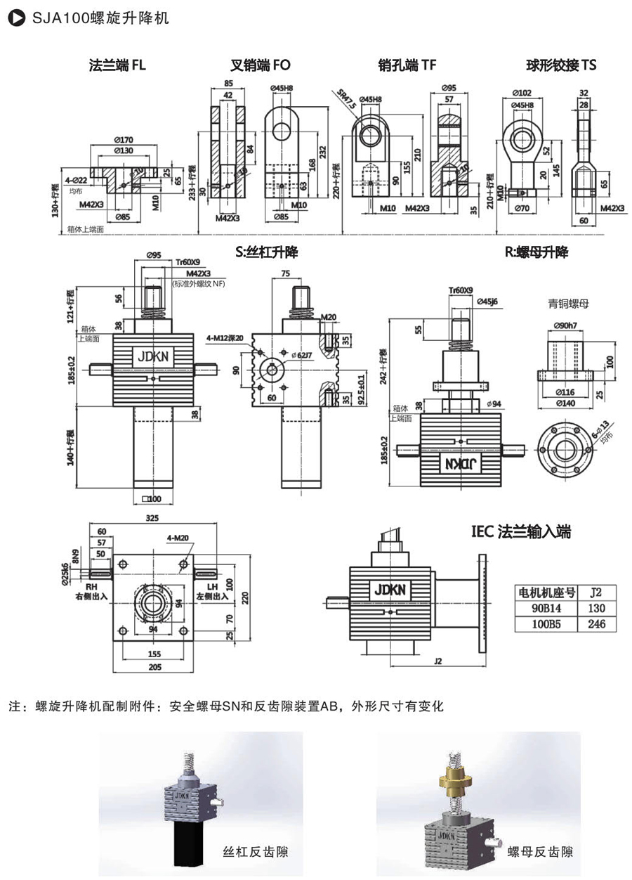 SJA螺旋升降機又稱SJA絲杠升降機,本產品是一種超重部件,可起升、下降及借助附件實現推進、翻轉及各種高度位置調整等功能。結構及裝配形式可選,可按客戶要求定制,安裝方便、使用靈活、功能多、配套及形式多、可靠性好、使用壽命長等優點。