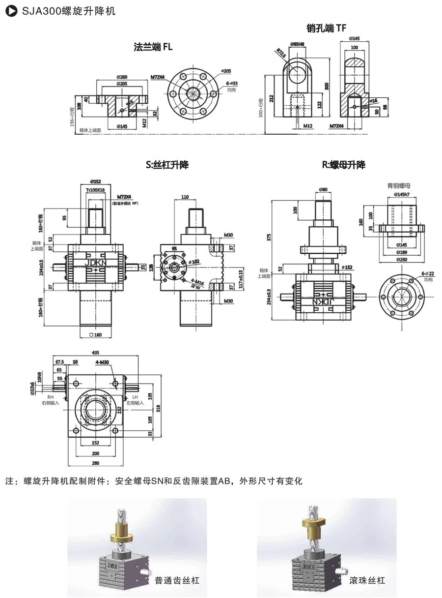 SJA螺旋升降機又稱SJA絲杠升降機,本產品是一種超重部件,可起升、下降及借助附件實現推進、翻轉及各種高度位置調整等功能。結構及裝配形式可選,可按客戶要求定制,安裝方便、使用靈活、功能多、配套及形式多、可靠性好、使用壽命長等優點。